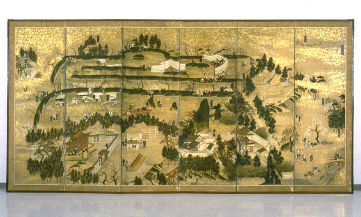 仙台藩四代藩主伊達綱村は,生母・三沢初子の冥福を祈り,元禄8年(1695),榴岡(つつじがおか)に釈迦堂を建立し,境内に彼岸桜(ひがんざくら),しだれ桜を植えて人々の遊覧の地とした。この絵には,その桜がまだ若木の頃の花見の情景が描かれている。緋毛氈(ひもうせん)を敷いての酒宴や散策する親子など,元禄時代の春の風俗が生き生きと描かれ興味深い。六曲半双 縦151.0cm 横318.0cm (個人所有・仙台市博物館所蔵)