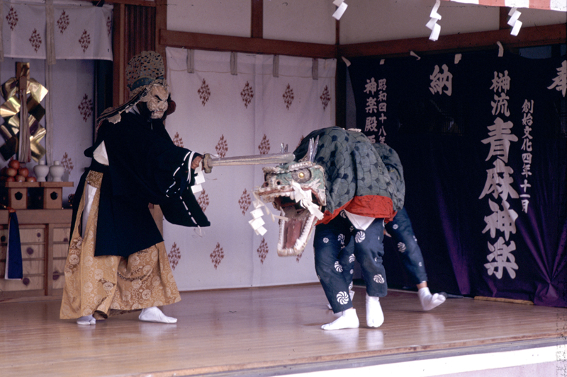 青麻神社は,仙台市と利府町との境,「県民の森」内の谷あいに鎮座する神社で,社殿によれば仁寿2年(852)の創建といわれている。この神社に伝わる神楽は,文化4年(1807)11月青麻神社32代神主・鈴木対馬が,京都において神祇官総領・白川神祇伯王家より相伝され,神楽道具類一式も調達してきたと伝えられている。仙台市とその周辺より南の仙台藩領内に伝来してきた十二座神楽の一系派で,青麻神社では「榊流(さかきりゅう)」を称しているが,その演目・芸態・装束などには木下白山神社丹波神楽(仙台市登録無形文化財)などの「丹波流」と呼ばれてきた流派との相似性が多く見られる。以前は隣町の利府町入菅谷(いりすがや)の12家により伝承されてきたが,昭和50年(1975)からは岩切青年団を主体として伝承されている。特に「諏訪の舞」別名「力だめしの舞」は,非力な男が「宣命」(「勅命」と記した白紙を折りたたんだ託宣様の文書)の霊力により大力を得て,大石を軽々と持ち上げ,得意げなしぐさをみせるストーリーで,黙劇の筋立てを軽妙に演じている。(演じられる時期と場所:5月1・3日 青麻神社春季例祭)