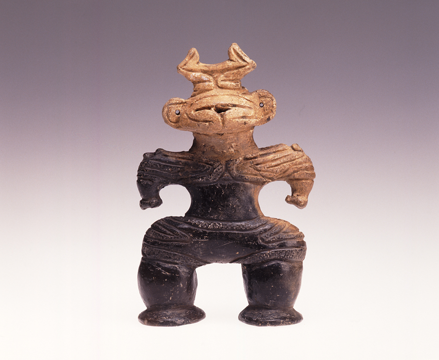 宮城県刈田郡蔵王町曲竹字鍛冶沢に所在する,鍛冶沢遺跡より出土したと伝えられる縄文時代晩期後半の土偶である。いわゆる遮光器土偶に後続する土偶と位置付けられる。東北の縄文時代晩期では、土器形式が概ね古い方から大洞B,BC,C1,C2,A,A'式に大別されているが、本資料は大洞C2式期から大洞A式期への移行期に属すると見られ、雲形紋が工字紋へ変形しつつある文様で構成されている。中空の土偶で,細部に残る塗膜から,全面が赤彩であった可能性が高い。わずかな欠損はあるが,完全な形で残されることの少ない土偶で,全体像がわかる貴重な資料である。