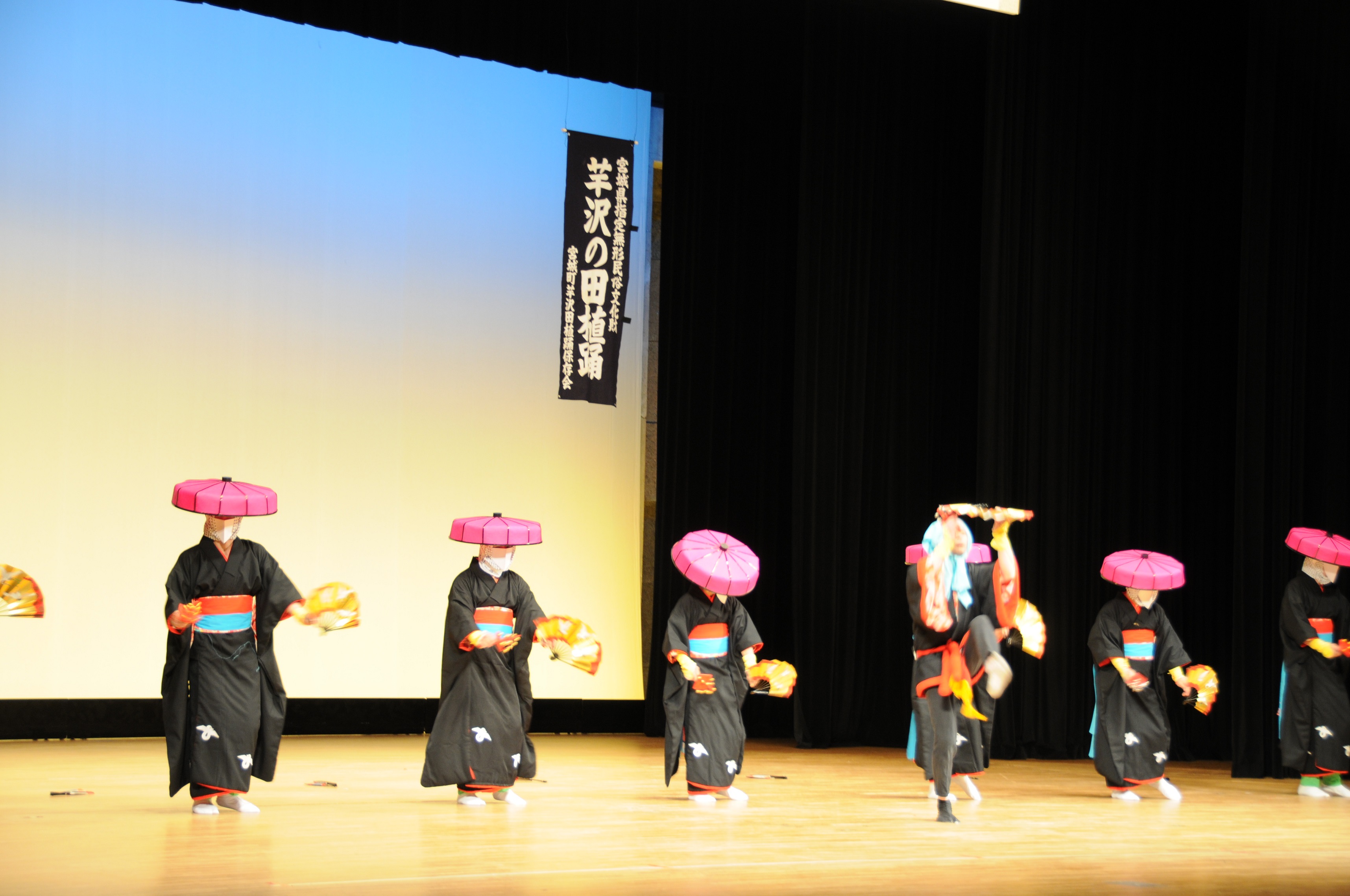 この地に残る田植踊は,芋沢の百姓喜太郎,平吉の兄弟が仙台城下へ行商に行った際に習得してきたもので,寛延2年(1749)1月より仙台藩五代藩主伊達吉村の許可を得て,踊られるようになったものだという。装束は,弥十郎(やんじゅうろう)は七兵衛・八兵衛の面をつけ,頭には独特な投頭巾をかぶる。早乙女(さおとめ)は顔に口紙(三角)のおおいをつけ,裾模様のある黒の振袖に胸高の広帯を締めた上にしごき帯を結び,その余りを後ろに長く垂らしている。花笠は紙張りの道中傘風のもので,飾花はない。弥十郎,早乙女の背紋の「丸に宮」は,伊達家が京都御所から許可を得て使用してきたものだと伝える。衣装は,今も古態を残して家督の成人男子が振袖姿の早乙女に扮装して踊られている。その装束や所作には,江戸中期以降仙台に巡業に来たという関西歌舞伎等の影響がみられ,特に早乙女が赤毛の小さな手獅子を持ち帯を回して日の丸扇を二枚重ねにした扇傘をかぶり鈴を持って踊る「獅子舞」には,歌舞伎の「石橋(しゃっきょう)」の影響が強く出ている。 (演じられる時期と場所 不定期)