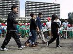 | 4年生の競技は,その場でぐるぐる回ってから走ったり、フラフープで縄跳びしたり、一輪車に乗ったり、キャタピラで進んだり…盛りだくさんのリレーでした。 | 5年生の競技「もう玉りません」。チームの代表がかごを背負って走り、相手チーム全員が追いかけてその中に玉を入れます。校庭中を駆け抜けました。 | 6年生の競技「粟野さんの手をはなしちゃイヤ〜ン」。男女が手をつないで走り、粉の中に隠れたあめ玉を口だけで食べてからゴールします。真っ白になった顔が美しい!? |
