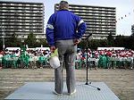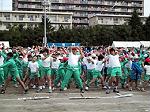 | 入場行進。クラスごとの入場だった春の運動会とはうって変わり、地区毎の入場です。大人も子供も一緒に入場します。 | 全員そろったところで開会式の始まりです。子供たちと地域の皆さん合わせて1000名近く集まったと思われるので、広い校庭もいっぱい。 | ラジオ体操。これだけの大人数で一斉に動くと、まるで波のよう。一つの集団演技をしているように大迫力でした。 |