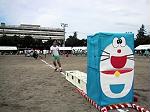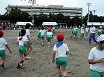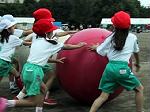 | 2年生の競技。広げたシートの中に玉を入れます。シートを持つ人はそれを大きく波打たせ、入った玉を外に追い出します。けっこう激しいぞ! | 1年生の競技は定番の大玉転がし。3人1組になって自身よりも大きな玉を運んでいきます。逆に大玉に転がされないようにがんばれ−! | 3年生の競技。「どこからでもどうぞ」。キャラクターに玉を当てるかかごの中に玉を入れたら次走者がスタートするリレーです。ねらいを定めて… |