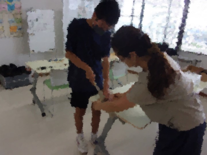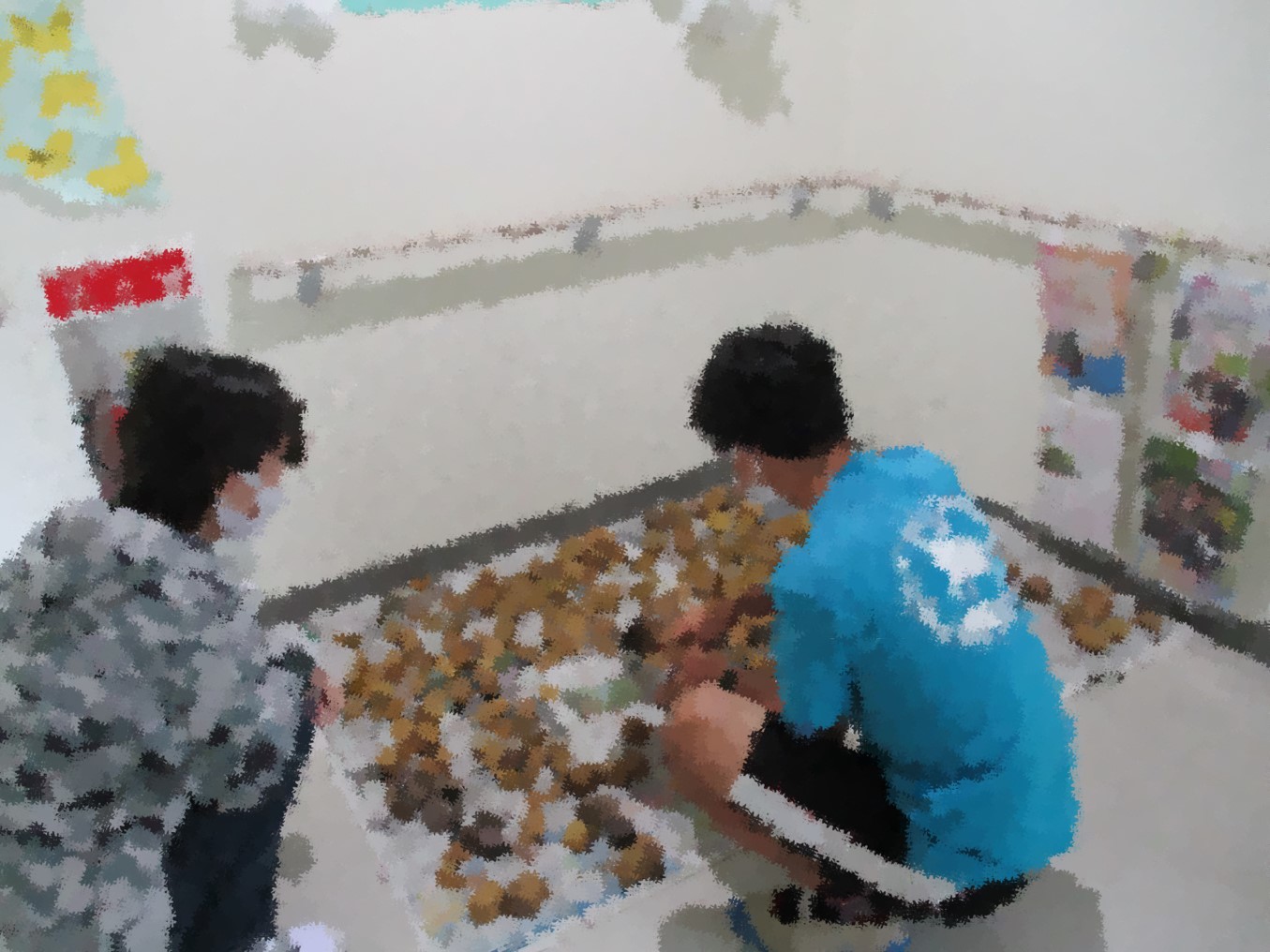勾玉はレンガや紙やすりを使って石を削っていきます。最後に目の細かい紙やすりで仕上げると光沢が表れ,通級生から感動の声が・・・。