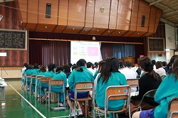 11月6日(月)に,3学年合同PTA行事として,地雷除去プロジェクトとして活躍している小松製作所の方を講師としてお招きしました。「地雷除去を通じた国際貢献」をテーマに地雷除去の体験や,海外の様々な文化についてお話しいただきました。講演の最後に「世界は楽しい!夢を持とう!自分の得意なことを2個見つけよう!」とのメッセージをいただきました。
