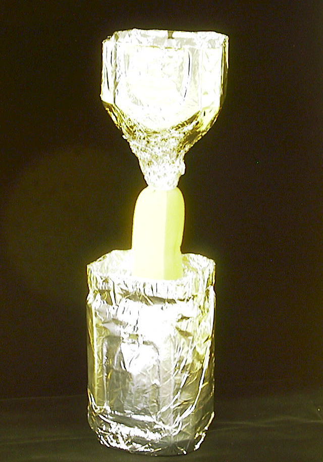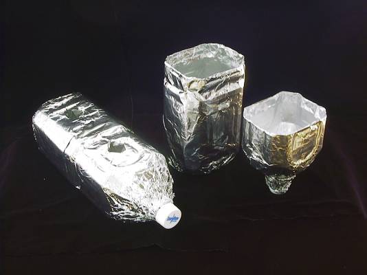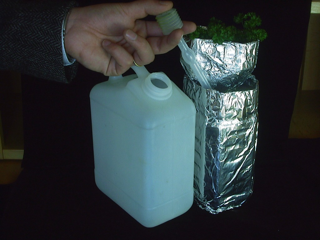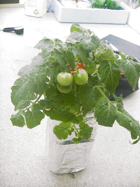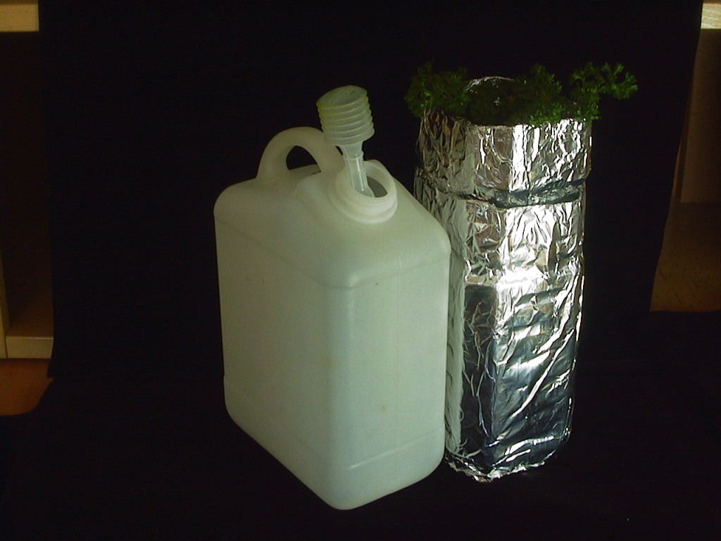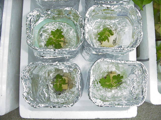 さらに,容器全体をこのように,アルミホイルで覆います。このことにより,根が遮光されるとともに,培養液が日光にあたらないことで,植物プランクトンの発生も防止されます。