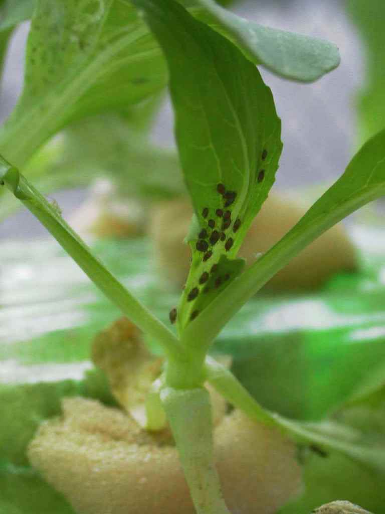 ・害虫としてはテラスで栽培したものにハモグリバエの幼虫,アブラムシ類が発生しました。写真はモモアカアブラムシです。