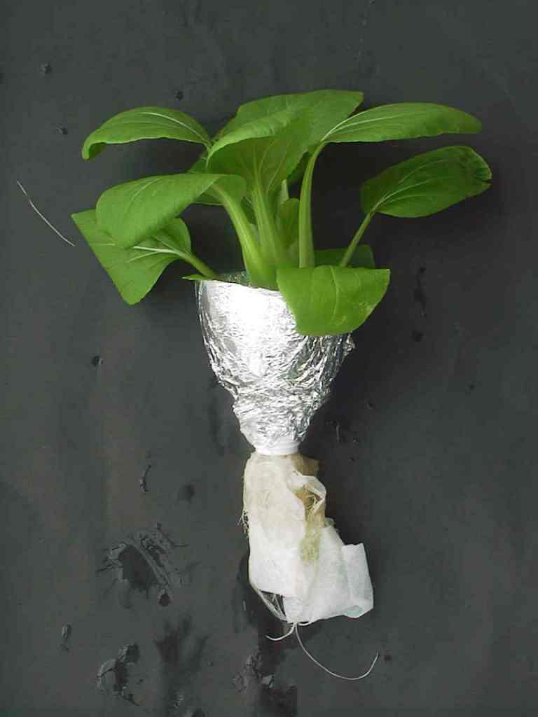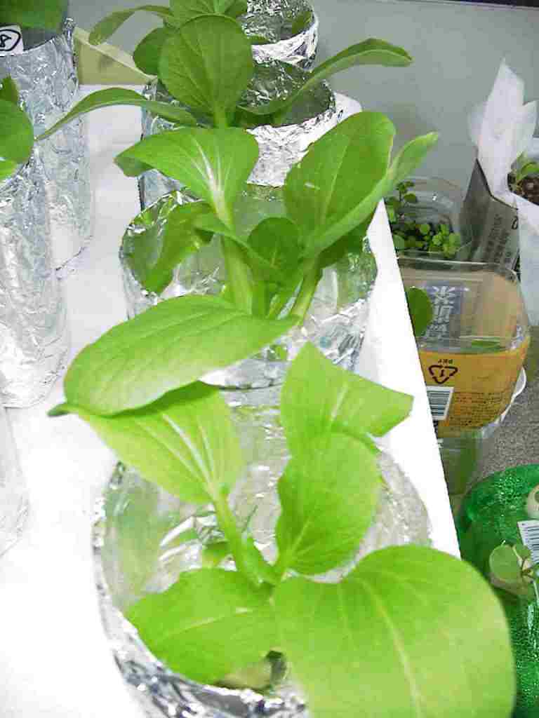・日当たりのある温室のような場所の日中の最高気温は30℃を越えることもありましたが,高温による障害は確認されませんでした。容器をアルミホイルで覆うことにより培養液温度の上昇が迎えられたことによるものと考えられます。