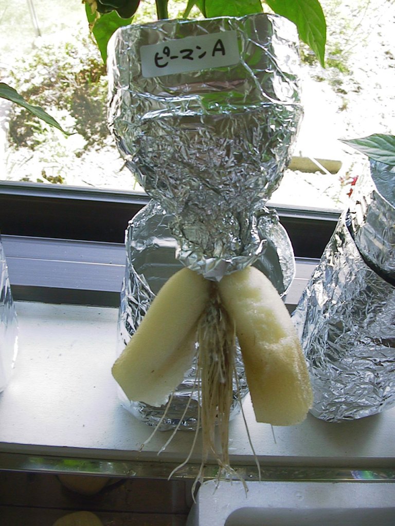 ・根にも異常は見られず,生育は良好と言えます。なお,日当たりの悪い窓辺で栽培していたものについては,日射量および温度の不足により,正常な生育がみられず,一部を温室に移動して経過観察を行いました。