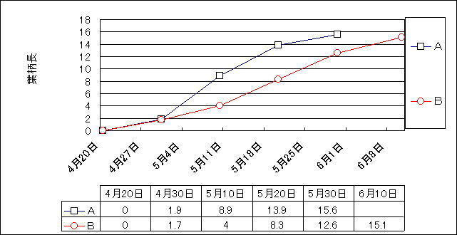 ・10日ごとに葉柄長の測定を行い,生育速度の違いについて調べるする。