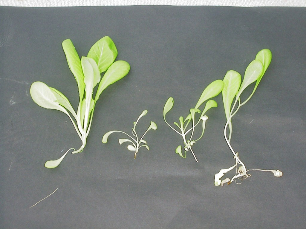 ・葉の緑色の濃淡や,肉厚の違いが確認されました。左側の写真が正常施肥,右側は無施肥のものです。