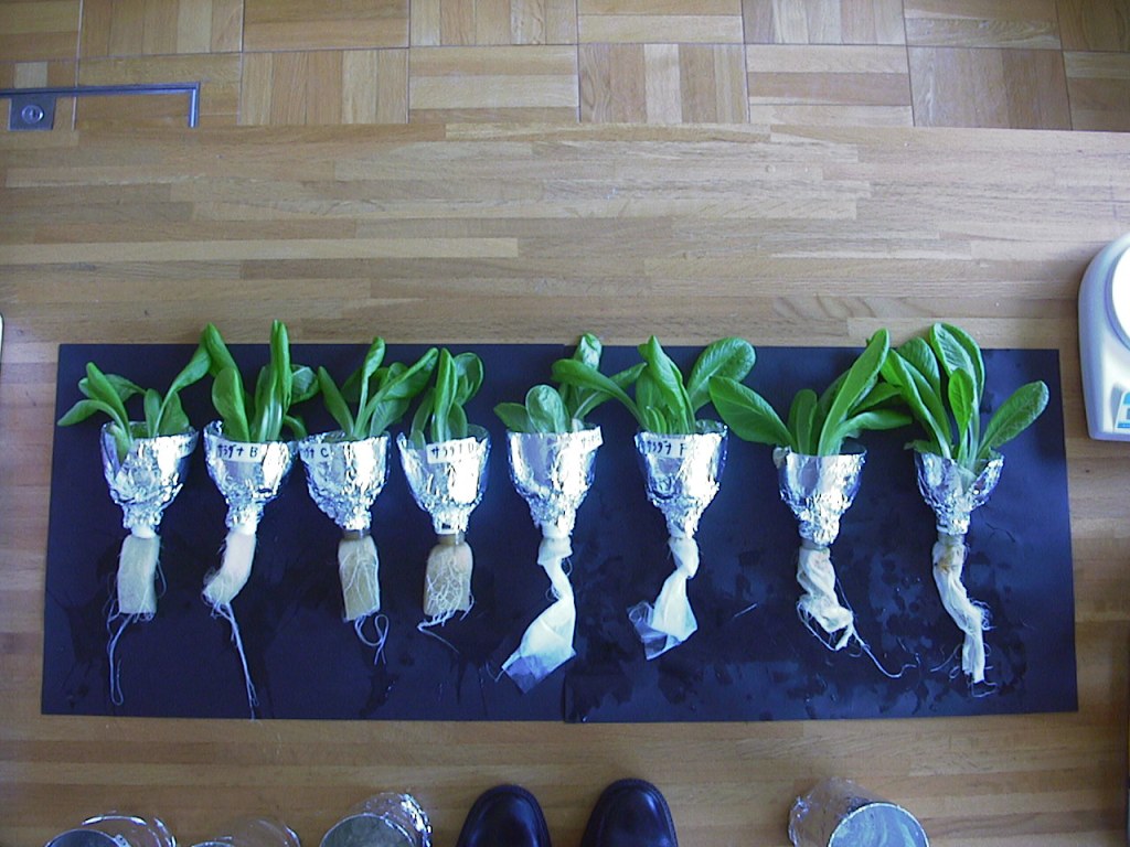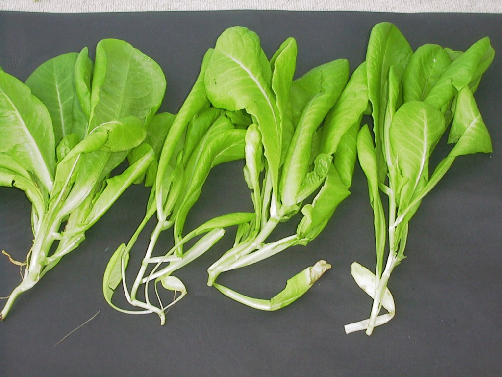 種蒔き後,38日目の状況です。左側4つが日あたりの少ない窓辺で栽培したもの,右側が4つが日当たりおよび温度が十分な温室のような場所で栽培したものです。右側のものについてはすでに収穫期を迎えており,葉柄長は最大のもので16p,平均15pほどでありました。葉柄長の違いに見られる差は,定植後10日程度から見られ始めました。環境条件によるものと考えられますが,いずれの栽培場所も温度に関してはサラダナのの生育適温の範囲内であり,このことから,この生育の差は光の条件によるものと考えられます。