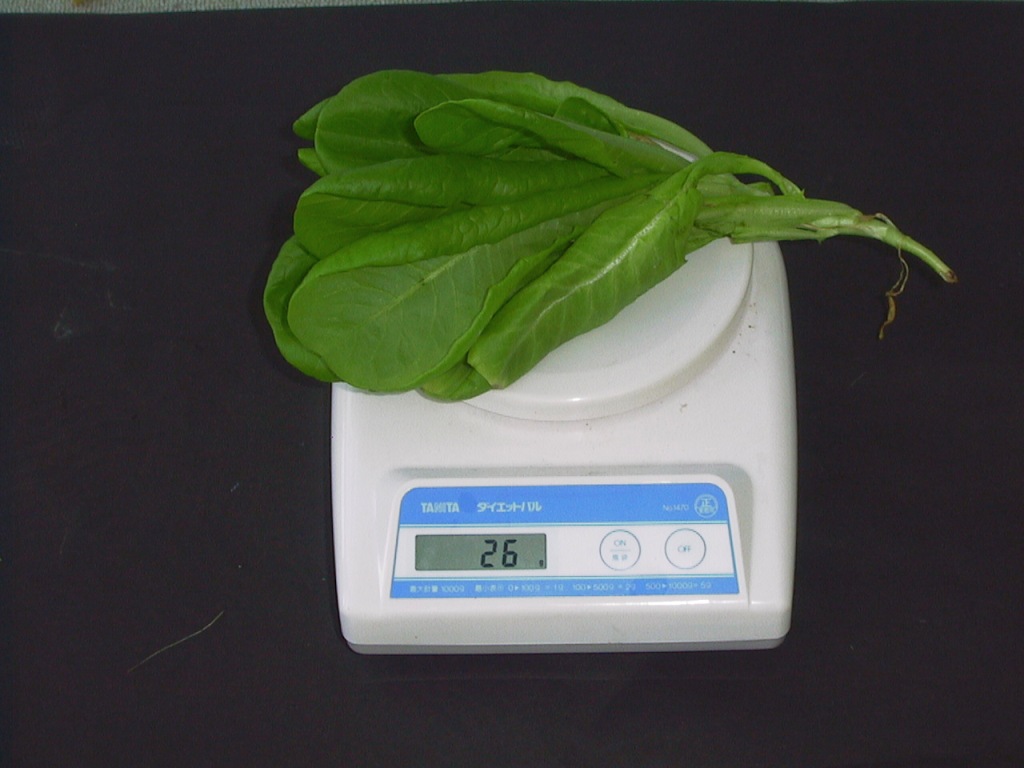 日当たりのある室内で栽培したものについては,種蒔きから40日で,日当たりの少ない窓辺で栽培したものについては種蒔きから50日目で収穫期を迎えました。写真は収穫内容を数値として把握するためにフレッシュウエイト(収穫直後の水分を含んだ状態の作物の質量)を計測しているところです。この結果収穫までに至った日数には10日程度の差がありましたが,収穫時の質量にはほとんど差は見られませんでした。このようにサラダナは,栽培期間が短く,光による影響を受けながらも確実に収穫にまで至る作物であるといえます。環境条件が異なった場所を選定し,環境条件と生育との関連を対照実験により追求するには,有効な素材であると考えられます。そのようなことに取り組むことにより,自宅でもどのような場所でどのように栽培できるかなどを体験的に身につけることができるものと思われます。
